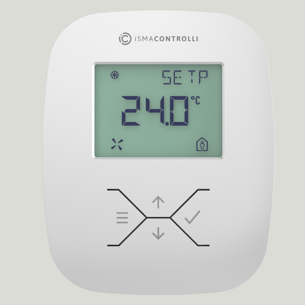 iSMA-B-LP-1 is a room unit with 2.3” LCD display and four function buttons. Additionally, the room unit has the built-in temperature sensor and optionally the humidity and CO2sensors.