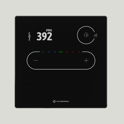Glass wall panel for VAV Control with TFT display, touch buttons, and temperature sensors.
